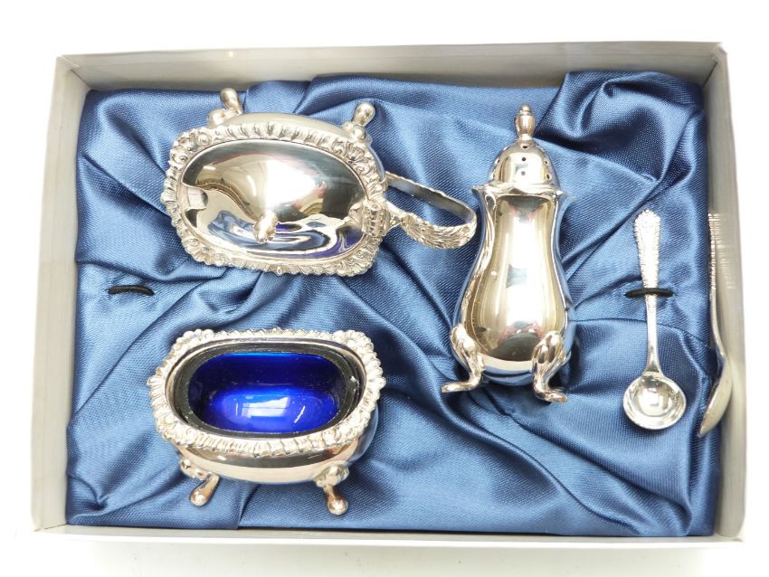 Boxed plated ware including cruet, inkwell, tankard and candlesticks, most by Laurence Watson