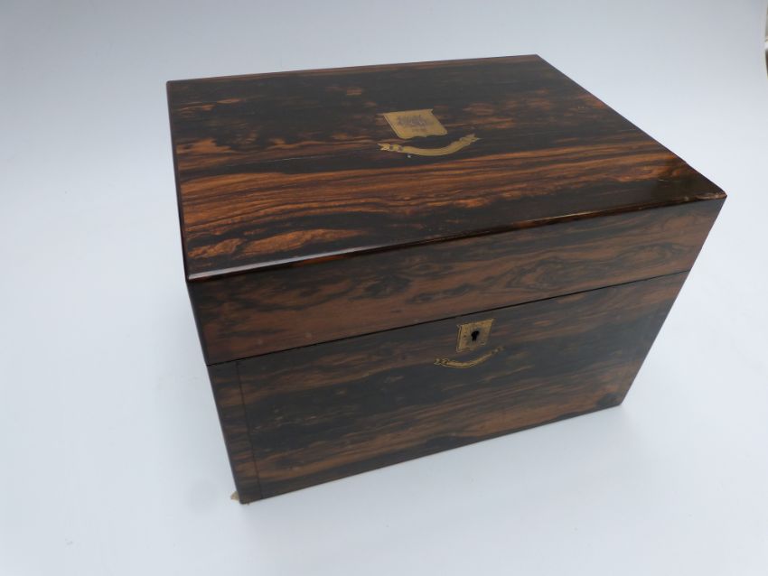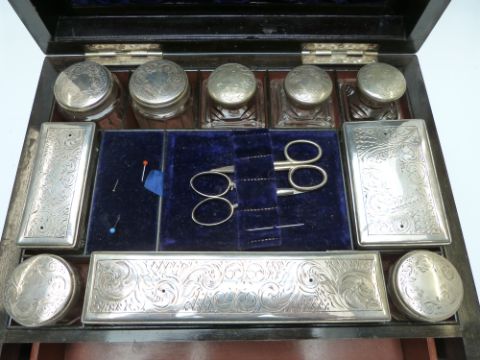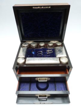 Victorian Coromandel travelling dressing table / work box with top tray of lidded glass bottles and two drawers below, one fitted for jewellery, W30.5 x D22 x H20cm