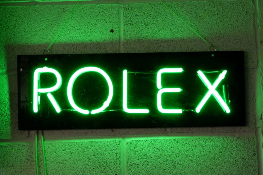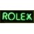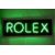 Rolex green neon ex shop display or advertising sign mounted on a black acrylic board, 75 x 25cm