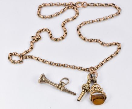 Victorian 9ct gold necklace (9g) with a watch key and a swivel fob