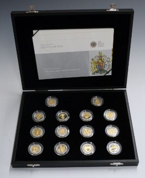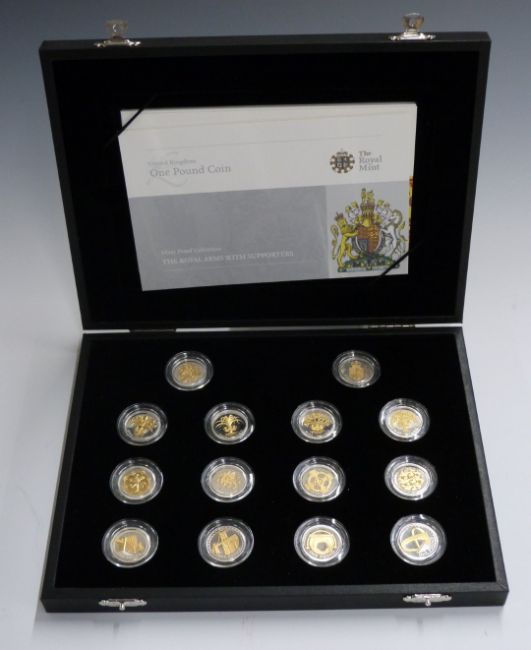 Royal Mint UK One Pound Coin 25th Anniversary Silver Proof Collection 2008,14 coins with gilt embellishment, in deluxe case with booklet and certificates