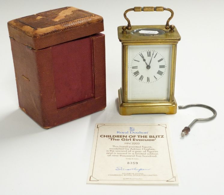 Brass corniche cased carriage clock with Roman enamelled dial, in original carry case, H10.5cm
