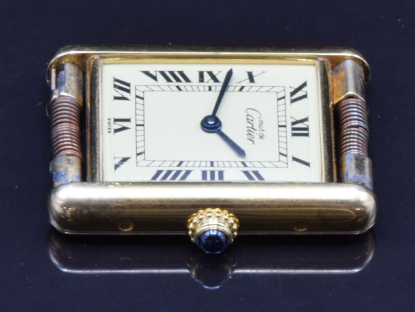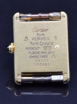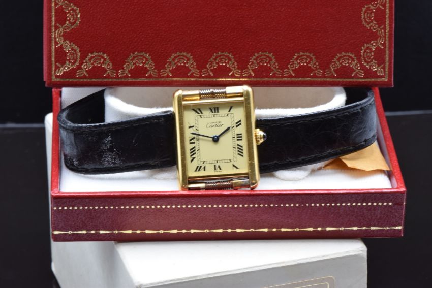 Must de Cartier Tank Vermeil silver gilt ladies wristwatch ref. 590005 with blued hands, black Roman numerals, champagne dial, sapphire set crown and quartz movement, on black leather strap, case diameter 23mm, serial number 28890, in original box with documentation and outer box