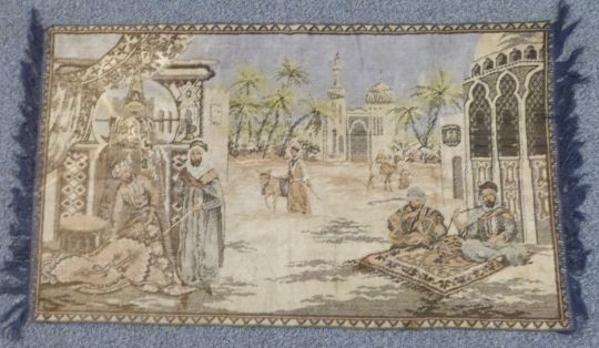 An early 20thC North African rug decorated with an Arab street scene, 105 x 60cm
