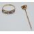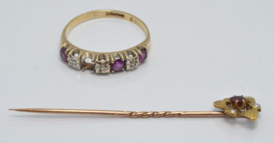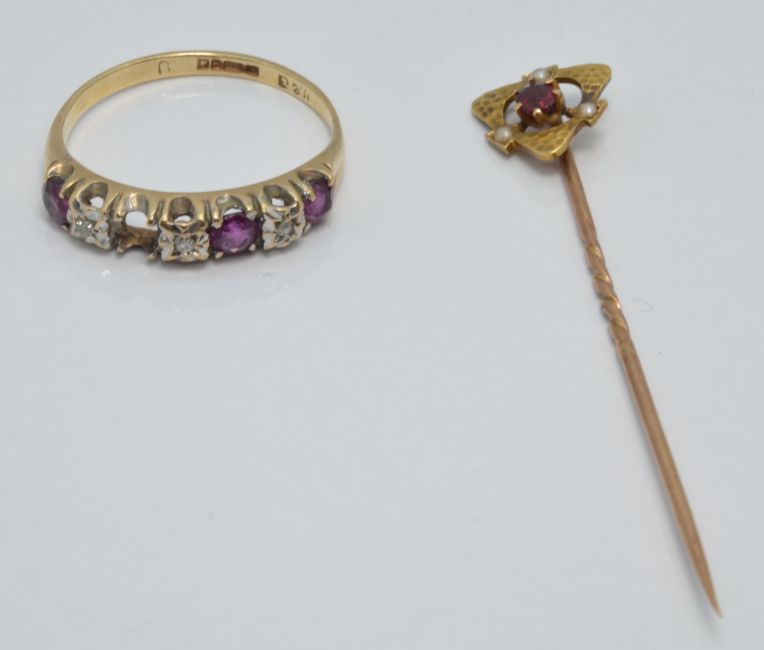 Art Nouveau 15ct gold stick pin set with a ruby and seed pearls (1g) and a 9ct gold ring set with rubies and diamonds (2g)