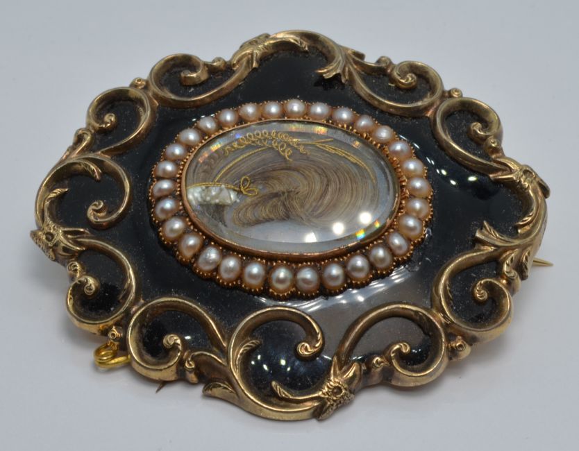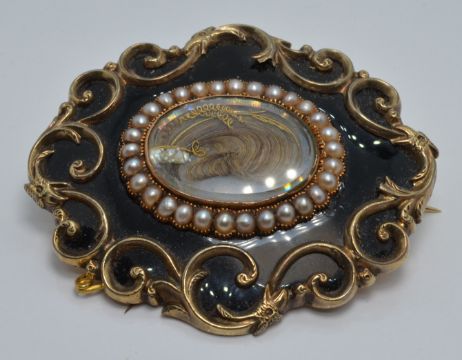 Victorian mourning brooch with a glass compartment to the centre set with hair within a border of split pearls and black enamel, inscribed to the back 'Mary Elizabeth Parsons Obt 2nd December 1860 at 57' , 6 x 5cm