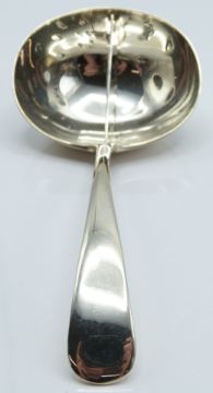 George V hallmarked silver mint sauce ladle with perforated divider, London 1935 maker Josiah Williams & Co, with patent number 296612 by Alfred Burton of Stroud, Gloucestershire, length 12.5cm, weight 37g