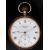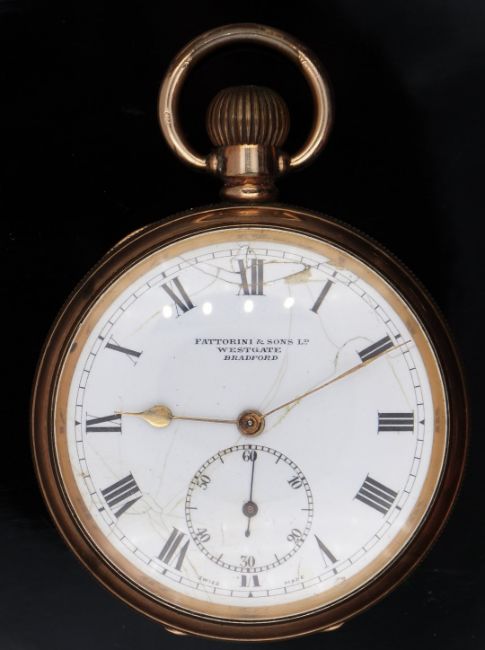 Fattorni & Sons of Westgate Bradford gold plated keyless winding open faced pocket watch with inset subsidiary seconds dial, gold hands, black Roman numerals, white enamel dial and La Pive movement, case diameter 50mm, serial number 332088, on white metal chain with seal and mounted coin