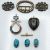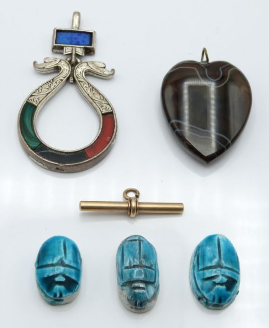 Victorian cut steel buckle, paste buckle, agate heart shaped pendant, scarab beetles and a yellow metal T bar