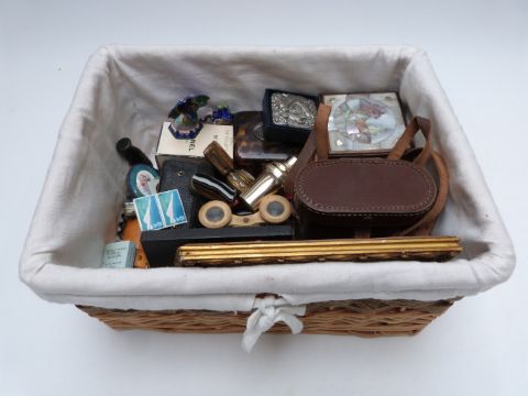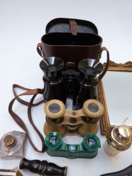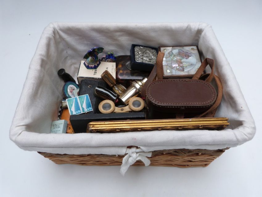 Collectables including mother of pearl inlaid rosewood Chinese box, enamel, agate and micromosaic vestas, pill boxes, faux tortoise shell cigarette case, perfume, binoculars and opera glasses, white metal and amber cheroot holders, Conway Stewart fountain pen, portrait miniatures, Onoto pencil, coins, enamel peacock and elephant marked "silver".