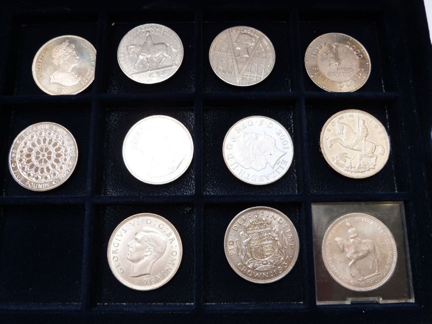 A coin tray containing twelve various modern crowns including £5 examples, a 1935 rocking horse crown, 1937 crown, 1951 etc