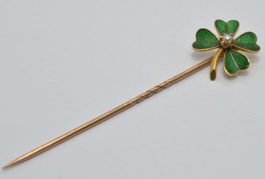 Victorian yellow metal stick pin set with green enamel and a seed pearl in the form of a four leaf clover