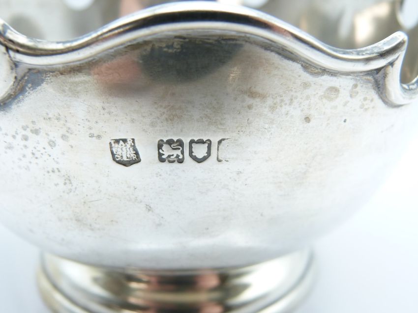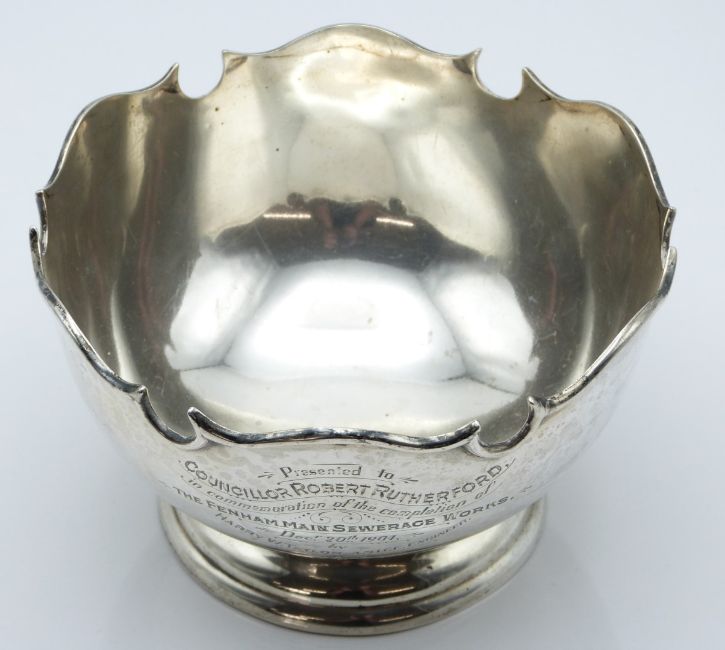 Edward VII hallmarked silver pedestal rose bowl with dedication for the completion of Fenham (Newcastle) main sewerage works 1904, London, date letter rubbed, maker Reid & Sons, diameter 14cm, weight 222g