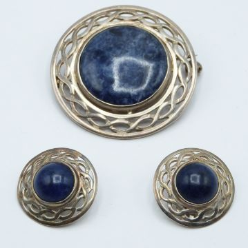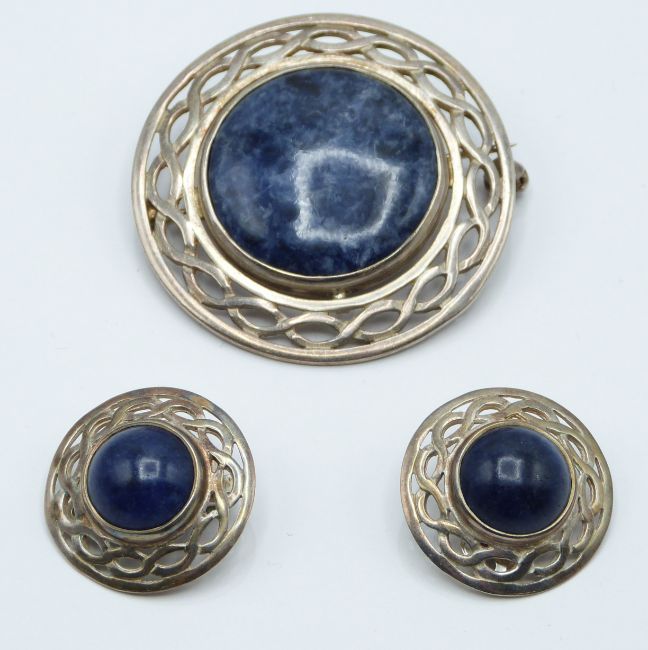 Celtic silver brooch set with sodalite, a pair of matching earrings and two white metal continental brooches set with paste