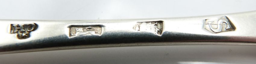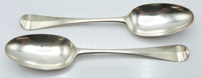 Pair of George I bottom hallmarked silver table spoons, London 1733 maker Caleb Hill, length 20cm, weight 102g