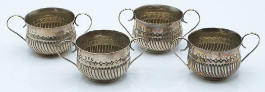 Victorian set of four Britannia standard hallmarked silver twin handled novelty miniature porringers or open salts, London 1896 maker Atkin Brothers, width 8cm, weight 130g