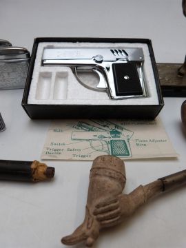 A horse and jockey table lighter, further lighters and pipes including Meerschaum and clay pipes including lady's leg