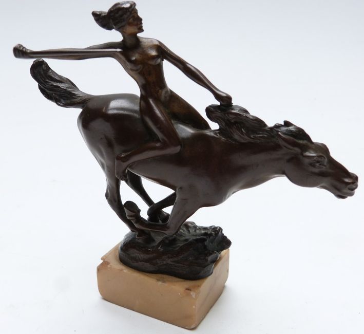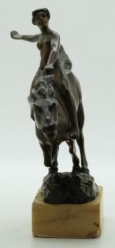 Nude bronze figurine wielding a sword on horseback, on marble plinth, height 13cm