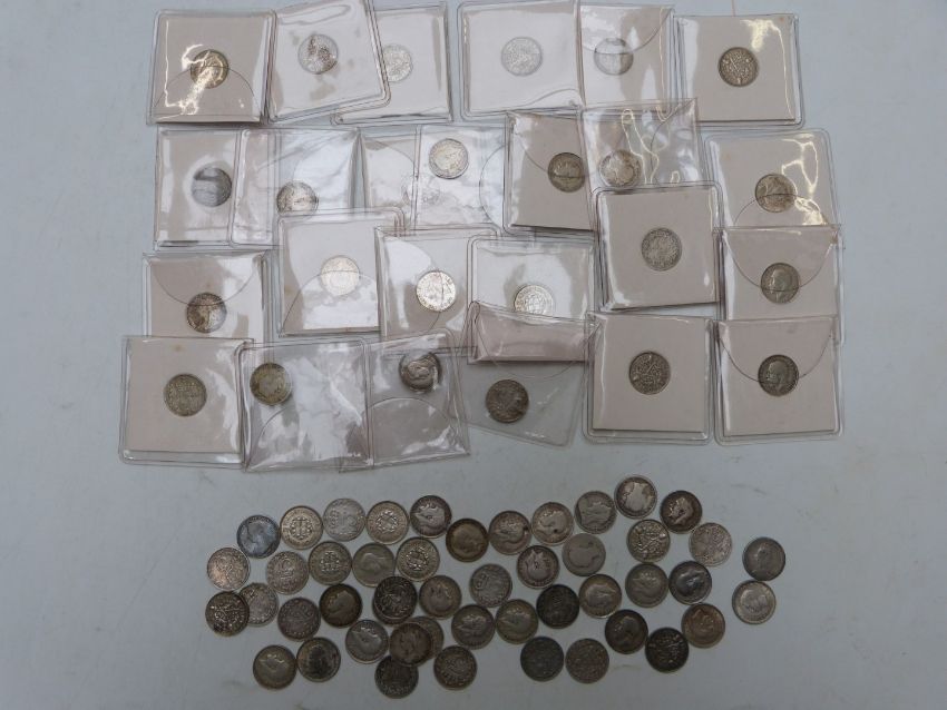 Over seventy silver threepence coins, Queen Victoria onwards