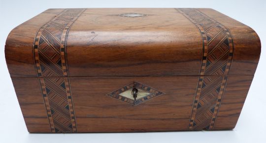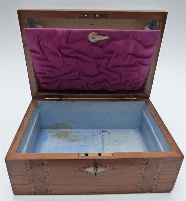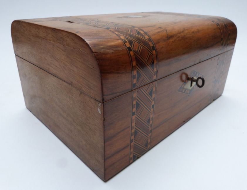 A 19thC walnut Tunbridge ware work / jewellery box with fitted interior lift out tray, W26 x D18 x H12cm