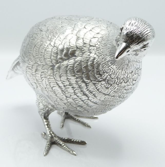 Pair of Elizabeth II hallmarked silver novelty partridges by Edward Barnard & Sons Ltd, Hatton Garden, London, both hallmarked to tails London 1988 and 1989, height of taller 16cm, weight of both 1270g