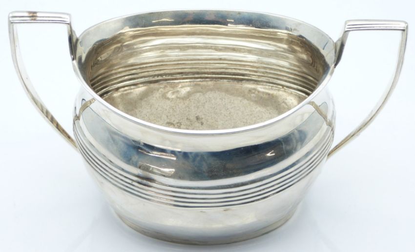 Victorian hallmarked silver twin-handled sugar bowl with ribbed decoration, Birmingham 1893 maker Nathan & Hayes, length 15cm, weight 150g