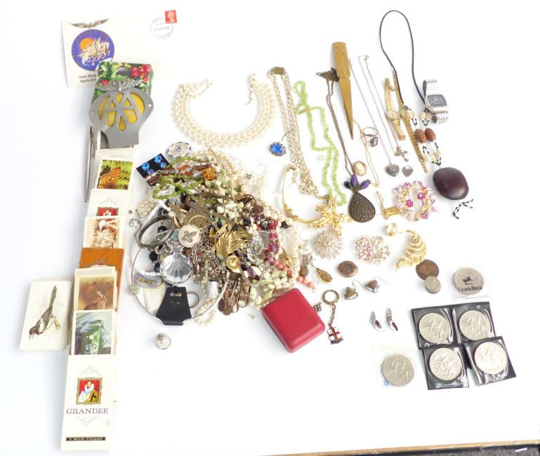 A collection of costume jewellery including silver rings, silver cameo, bangle, beads etc