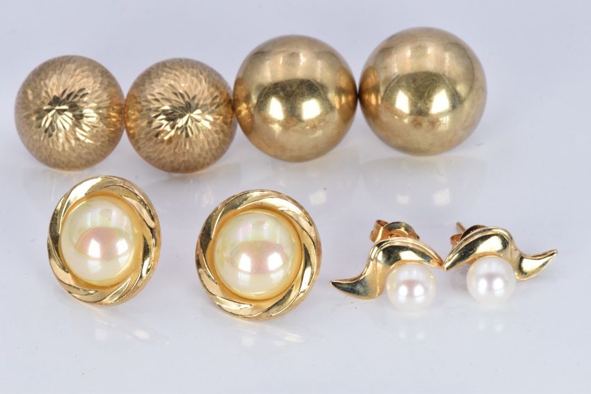 Two pairs of 9ct gold earrings (5.1g), a pair of 9ct gold earrings set with a pearl to each (2g) and a pair of yellow metal earrings