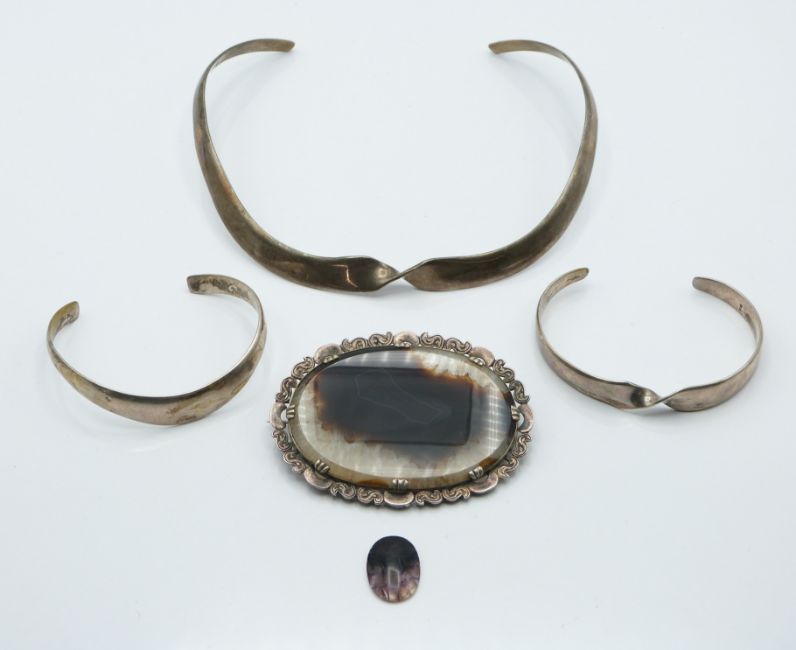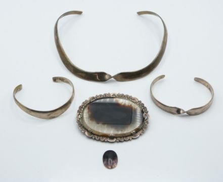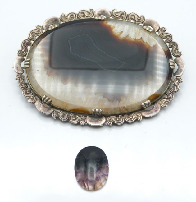 Victorian large agate brooch, Blue John cabochon and suite of jewellery impressed 925