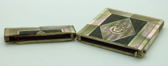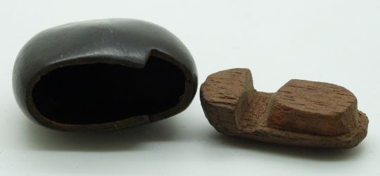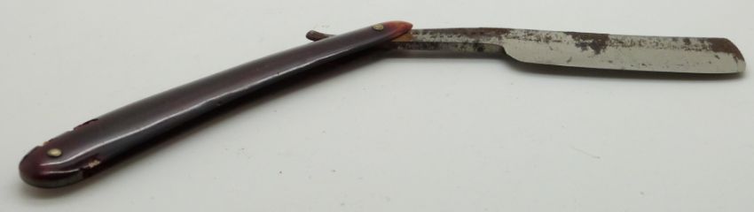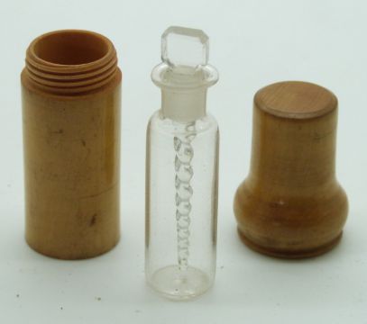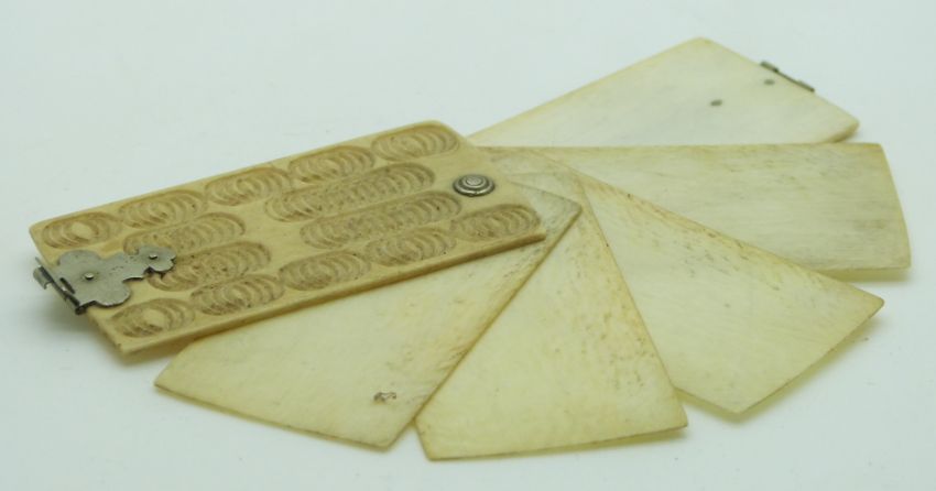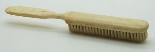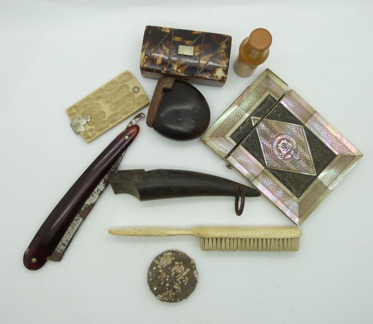 A collection of 19thC bijouterie and treen including an ivory dance card, treen nut snuff box, turned boxwood vessel with glass container with twisted glass dropper, large horn whistle and a bone brush by Fisher, 188 The Strand, cut throat razor by John Heiffor, Sheffield, carved heart, locket etc, longest 15cm