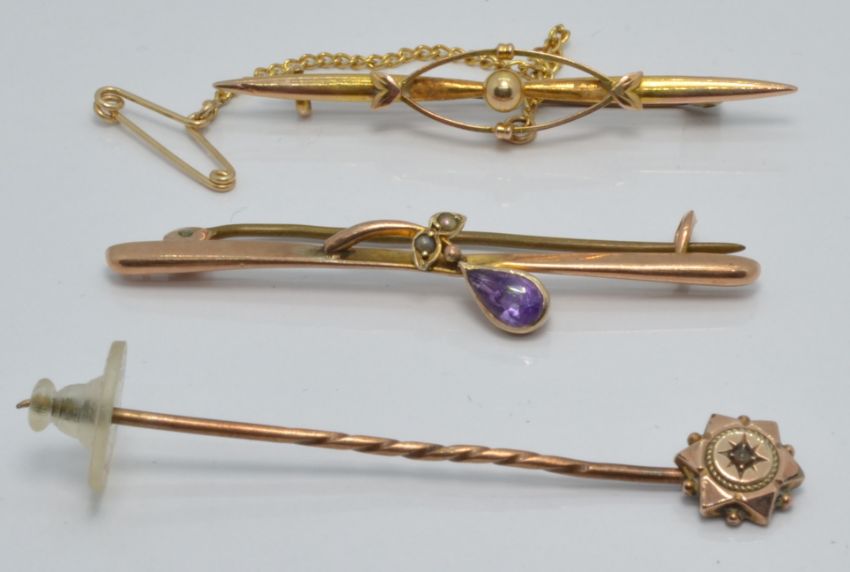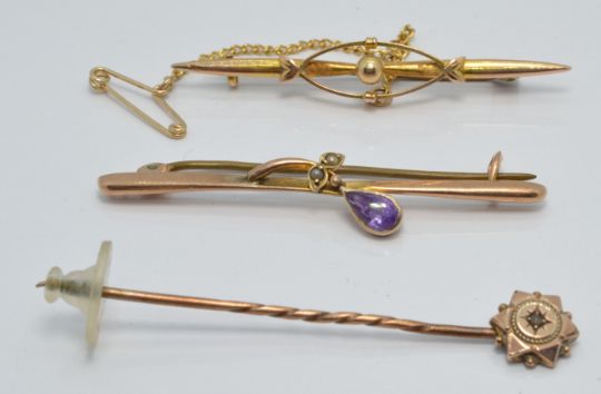 A 9ct gold brooch set with an amethyst, a 9ct gold brooch and a 9ct gold stick pin, 4.5g