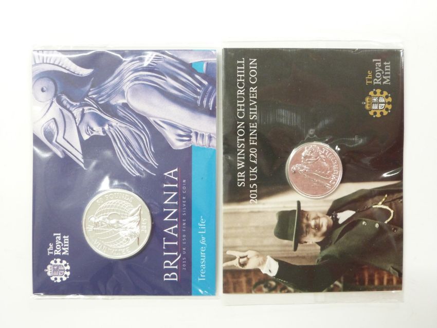 Royal Mint Sir Winston Churchill 2015 UK £20 fine silver coin together with a Royal Mint £50 2015 silver Britannia coin, both in presentation packs