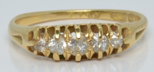 Victorian 18ct gold ring set with five diamonds, Birmingham 1898, 3.0g, size O/P