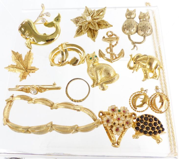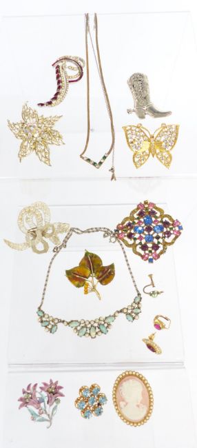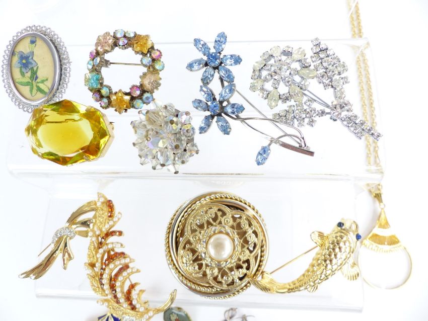 A collection of vintage brooches including a silver brooch, diamanté etc