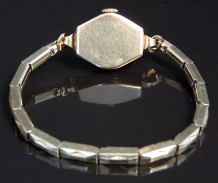 Rotary 9ct gold ladies wristwatch with gold hands and Arabic numerals, railroad minute track, champagne dial and signed 15 jewel calibre 570 movement, on gold plated bracelet, case diameter 16mm, serial number 58251