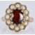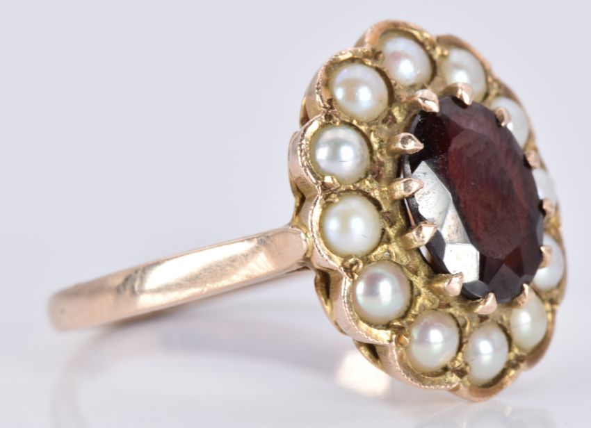 A 9ct gold ring set with an oval garnet surrounded by pearls, 3.8g, size L