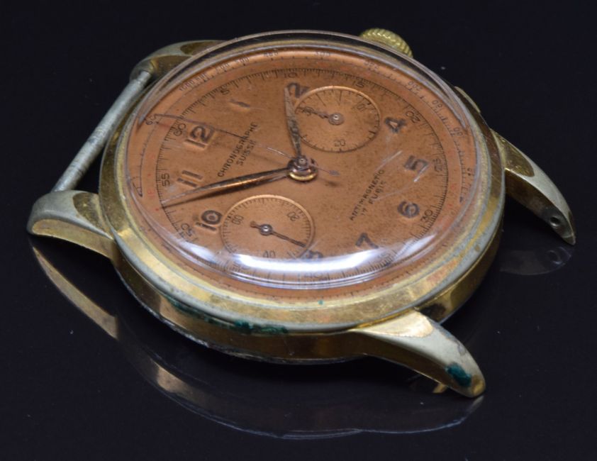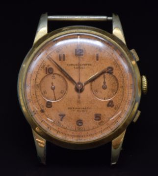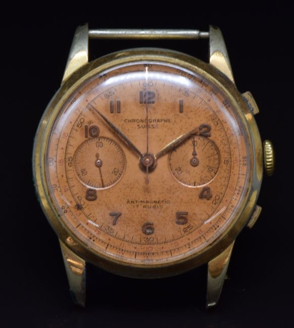 Chronographe Suisse gentleman's chronograph wristwatch with gold hands and Arabic numerals, bronze dial, gold plated case and Landeron calibre 48 movement, case diameter 38mm