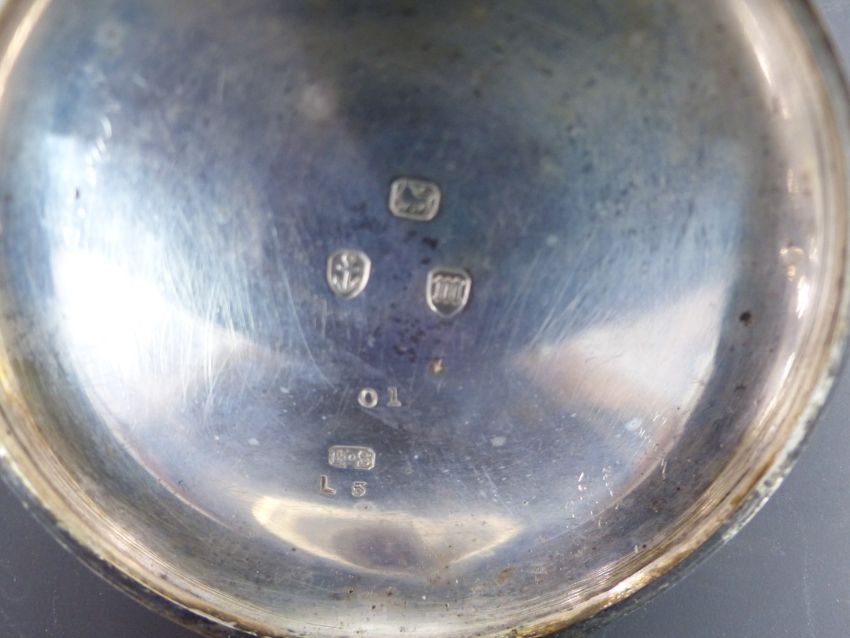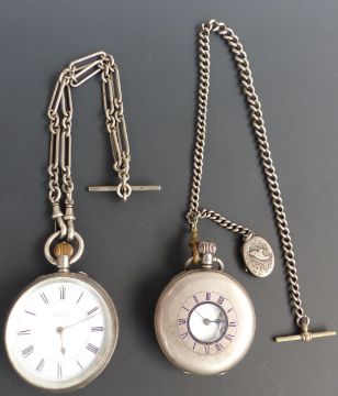 Two hallmarked silver keyless winding pocket watches, one half hunter with subsidiary seconds dial, blued hands, black Roman numerals, white enamel dial, inlaid blue enamel Roman numerals to the case and 7 jewel movement, case diameter 50mm, serial number 541919, on white metal chain the other H Samuel of Market Street Manchester with gold hands, black Roman numerals, stepped white enamel dial and signed movement, case diameter 54mm, serial number 82401, on hallmarked silver chain