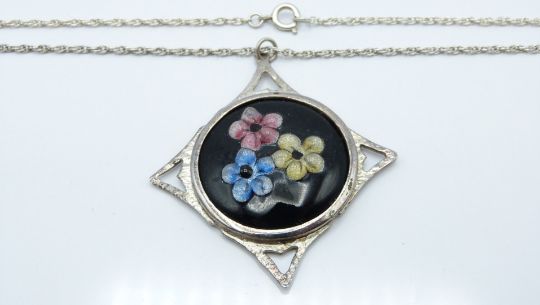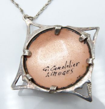 Early 20thC silver pendant set with enamel, verso signed G Canelelier, Limoges, 12.5g, L - 33 cm