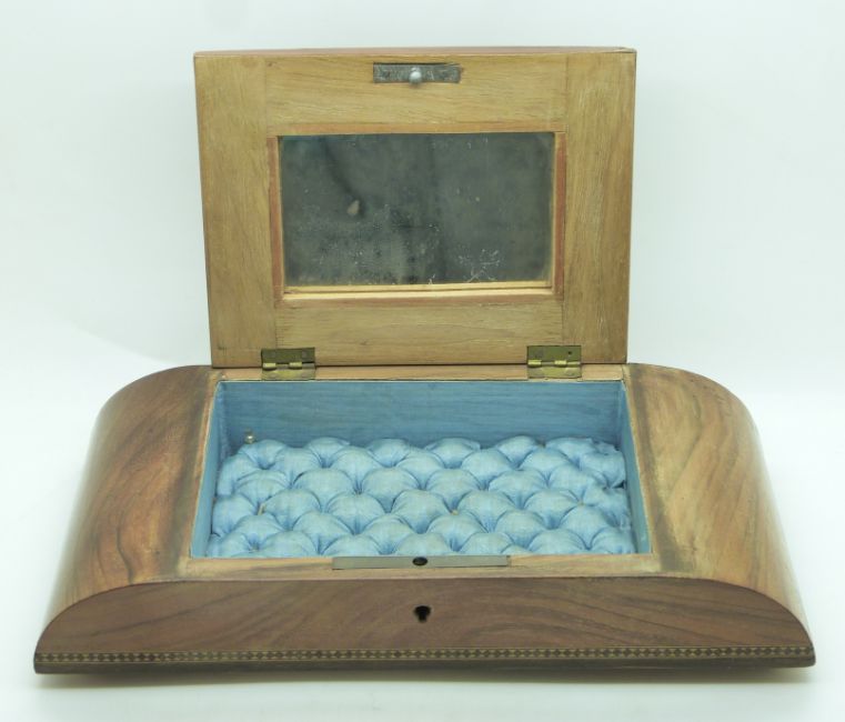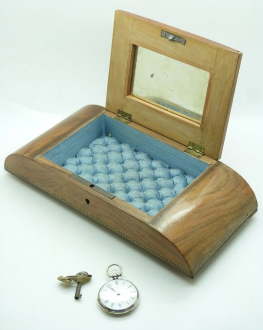 A late 19th century/ 20th century Tunbridge ware trinket box, the interior with padded base and mirror, width 25cm together with white metal fob watch by Baume of Geneva