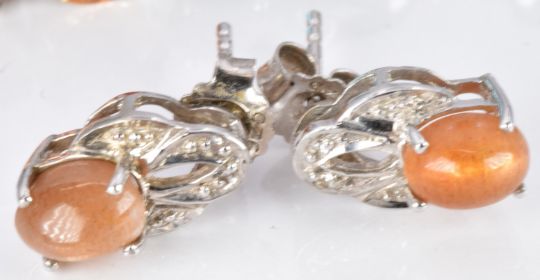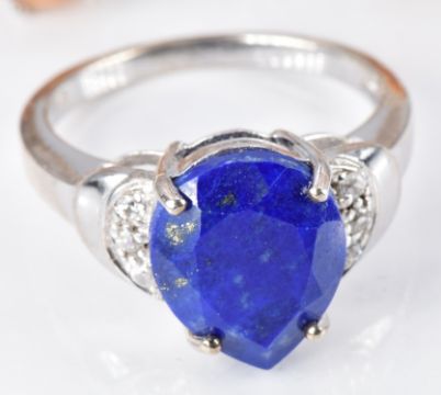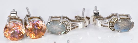 A silver ring set with a pear cut lapis lazuli and zircons and three pairs of silver earrings set with labradorite and topaz, cat's eye sunstone and topaz and a pair of silver earrings set with twilight topaz