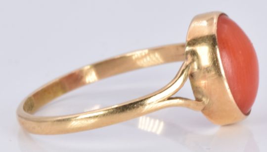 An 18ct gold ring set with a coral cabochon, 1.7g, size M