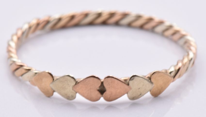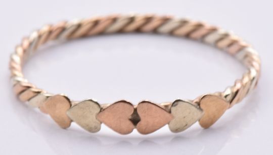 A 9ct gold tri-coloured ring with heart decoration, 0.9g, size O