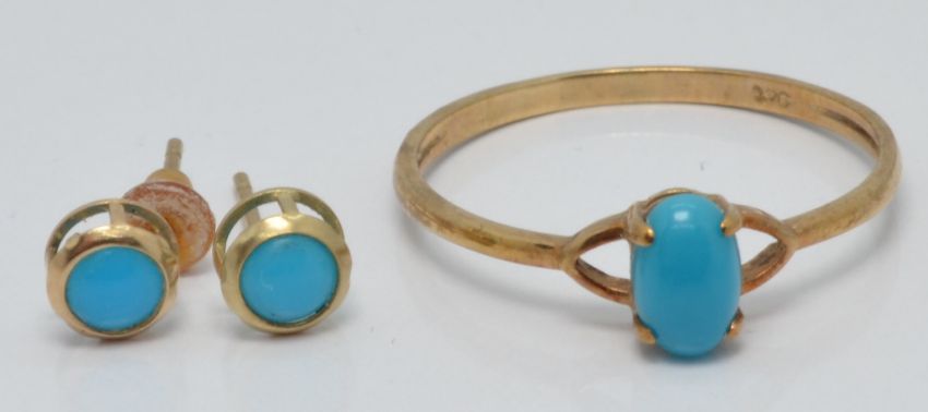 A 9ct gold ring and a pair of 9ct gold earrings, 1.1g