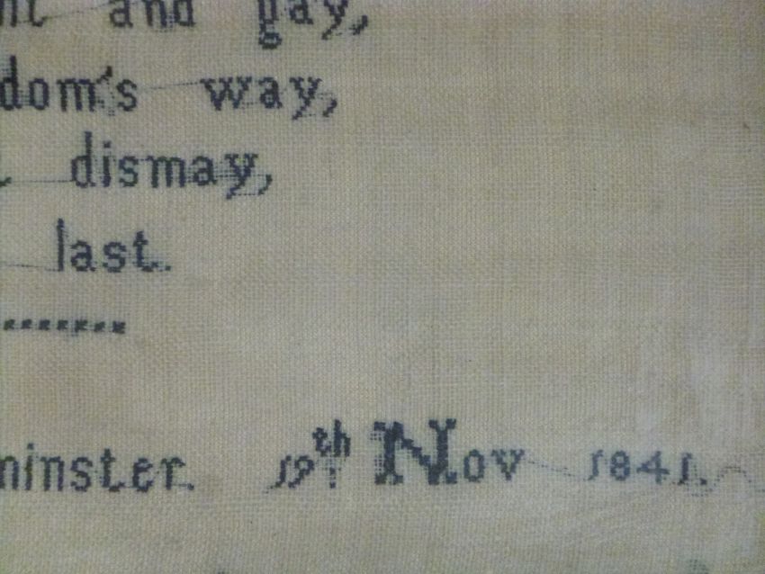 An early Victorian embroidery sampler by Emma Whittock Harris, Warminster 1841, 40 x 32cm