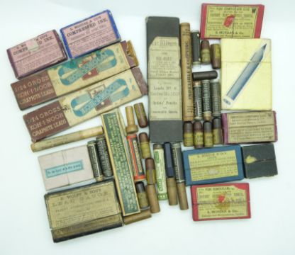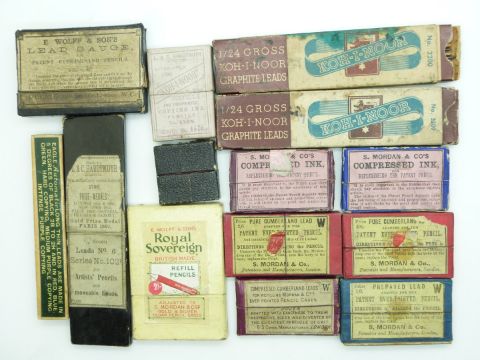 Forty-two pen and propelling pencil lead and accessory boxes including S Mordan & Co's Compressed Ink, S Mordan & Co's Leads, E Wolff & Sons Lead Gauge, Monument Refills, B S Cohen etc