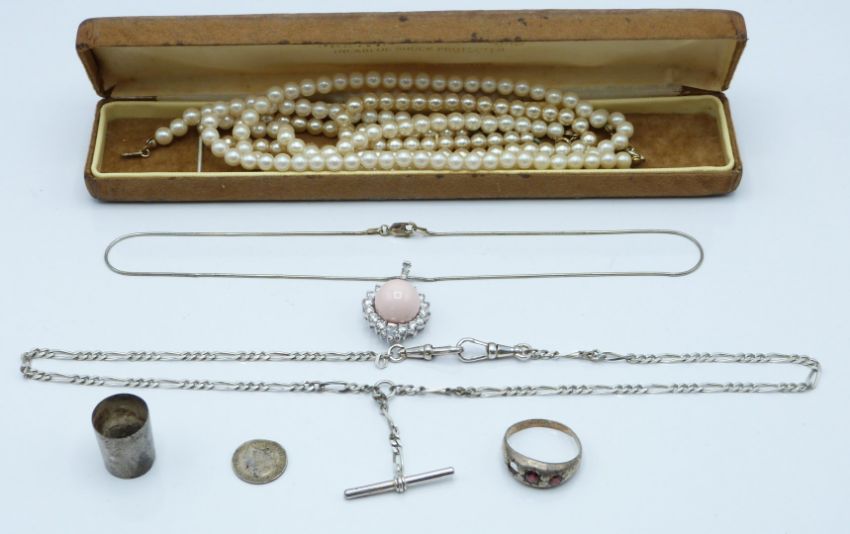 Three hallmarked silver candlesticks, Georgian teaspoon, weight 31g, hallmarked silver double Albert watch chain, jewellery including pearls etc