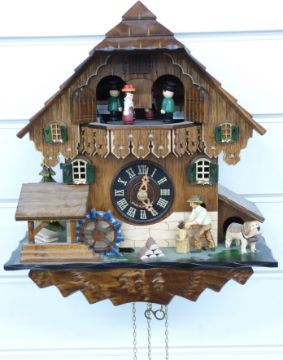 Black Forest cuckoo clock c1970 with three train weighted movement incorporating automaton musical dancers, waterwheel and woodcutter