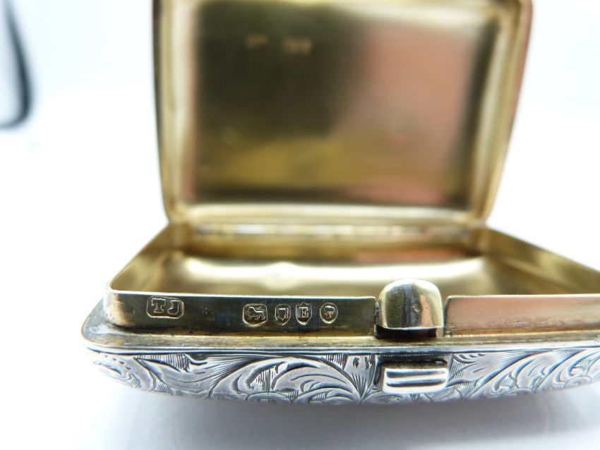 Victorian hallmarked silver pill or snuff box with engraved decoration and gilt wash interior, London 1880 maker Thomas Johnson II, width 58mm, weight 48g