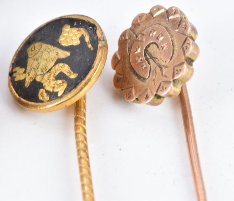 Victorian 9ct gold stick pin with horseshoe decoration (0.7g), and Toledo stick pins